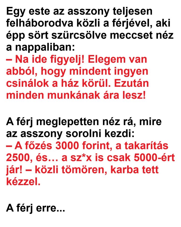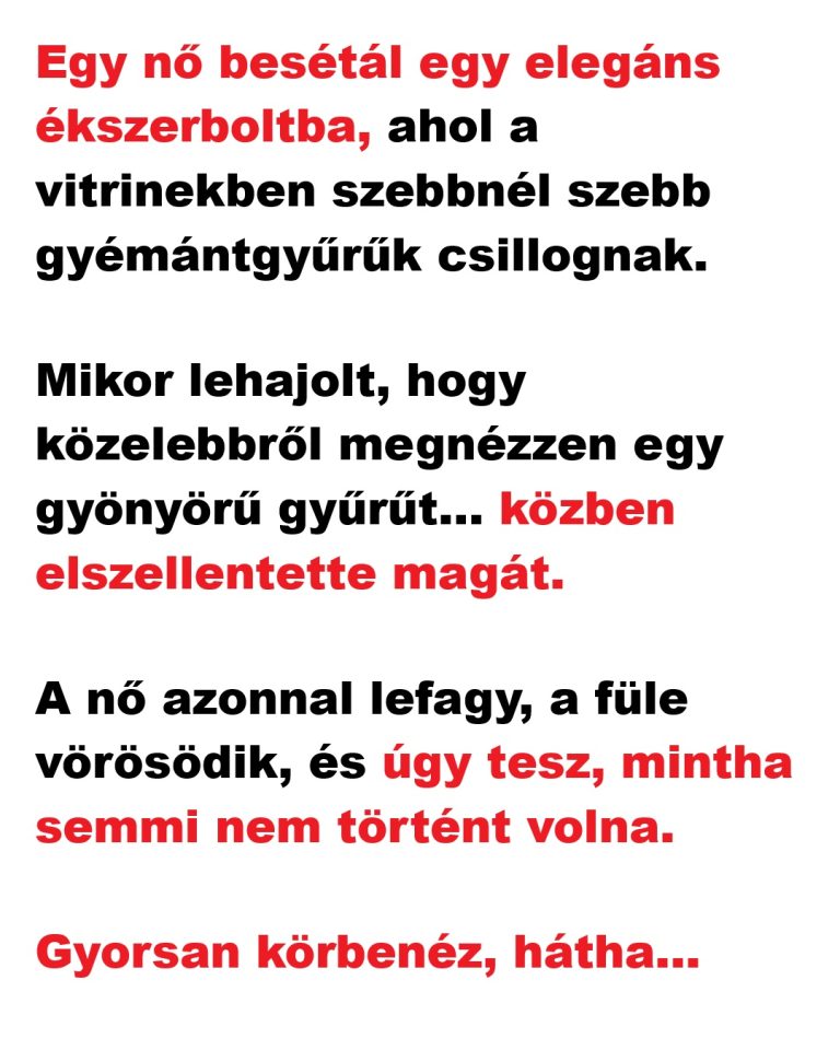 Szőke nő fel-alá járkál a telefonfülke előtt, mert a mamájának akar telefonálni, de nincs nála aprópénz. Jön egy pasi, a szőke odasiet hozzá: – Kérem uram, bármit megteszek csak adjon egy kis aprópénzt, mert muszáj telefonálnom! – Bármit? Jó, akkor…