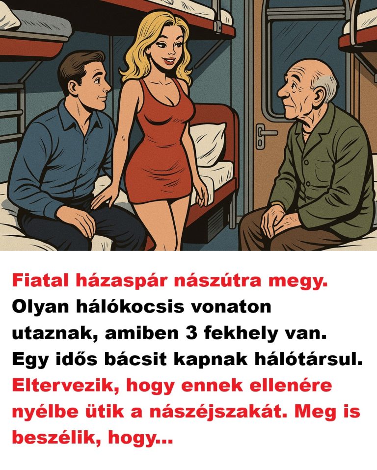 Fiatal házaspár nászútra megy. Olyan hálókocsis vonaton utaznak, amiben 3 fekhely van. Egy idős bácsit kapnak hálótársul. Eltervezik, hogy ennek ellenére nyélbe ütik a nászéjszakát. Meg is beszélik, hogy az asszonyka fog legfölül aludni, a bácsika középen, a férj legalul.…